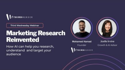 AI Strategy Third Wednesday Webinar Presents: Marketing Research Reinvented Elizabeth Holloway Strategy 27 mins read April 28, 2025 Blog Strategy Third Wednesday Webinar Presents: Marketing Research Reinvented Every third Wednesday of the month, we host our Third Wednesday Webinars, where we bring you expert insights on a variety of topics. If you weren’t able to attend our last webinar, we’re including the video and transcript for Marketing Research Reinvented: How AI Can Help You Research, Understand, and Target Your Audience, hosted by Third Wunder founder and president, Mohamed Hamad and guest Joelle Irvine. Mohamed Hamad: Hello, everybody. Welcome to the Third Wunder webinar, our Third Wednesday Webinar every third Wednesday. Today we are gonna be talking about marketing research reinvented, how to use AI to humanize your marketing. I’ve got the lovely Joel Irvine here to help us walk through this topic. She’s a growth and AI advisor and has been playing around with AI for marketing specifically for the last—I’ll let her introduce herself in that topic specifically. But yes, Joelle, a little bit of an intro. Joelle Irvine: Yeah, hi everybody. So, I’m Joel. I’m a growth in AI advisor. I’ve been tinkering with AI and learning all the things for the past, I don’t know, six or so months. And so yeah, I work primarily with SaaS and ecommerce companies, and some agencies to help them with their growth strategies, product marketing, analytics, and I’ve now embedded some AI services into the mix, so doing a little bit of everything, but it’s always in the focus of growth marketing. Mohamed Hamad: Yeah. So we wanted to talk about AI because, you know, it’s top of mind for everybody. Everybody’s got concepts that it’s gonna take their jobs, or it’s going to revolutionize something, or it’s going to, you know, destroy the planet, whatever it is, the conversation, it is top of mind. And while the big promise of AI is that it’s going to write things for you. The way it’s been marketed most recently is it’s going to write your emails, it’s gonna write your content, it’s gonna write your social. But we wanted to take a step back a little bit and kind of rethink how to use AI and some of the features around the latest updates and how to incorporate those features in research, which is something that’s very underserved but can really help you speed up how you do research with AI. The thing behind that is that AI’s can ingest large amounts of data very quickly and find patterns very quickly. So this is where the time saving comes in. When looking through an enormous amount of blog posts, for instance, or big data sheets, or lots of call transcripts or whatever it is, it can pull it all together in seconds, highlight the things, and find the things that you really might miss out on because, you know, after a while of reading like 10,000 page reports or, you know, 20 blog posts about the same topic, you just kind of glaze over things. So, one of the things that we are discussing here is how to use AI for research. I’ll hand it over to you, Joelle, on what are you, how are you using AI for research and what are some of the tips that you would like to give us around what your workflow is like? Joelle Irvine: Yeah, for sure. So I’m gonna take a step back for a second and just tell you how this all started. So, working in many companies, you know, leading the marketing team, essentially, we’ve always hit these, these areas where each team has their own data, you know, like the marketing team has data, the product team has data, customer success, sales, everybody has their own data, but a lot of the times. That there’s a lot of gaps between shared information and teams tend to work in silos. And so I started off my exploration of AI to find a solution for this. So I started there, but that’s a really big problem to solve. So I’m really focusing on the area, which I know most right now, and that’s on the marketing side. And looking at marketing research that could be used across different parts of the organization. So in terms of my workflow, to answer your question, I use AI to help me, I’m gonna say go from A to B. So, I have my initial information like I’ll know what the product is or what the problem is I’m trying to solve, or who the user is or things like this, and then I use that data to explore other topics. So, in terms of use cases, you could think of like when a lead comes in and you want to research them quickly, you know, for prospecting or for pitching, you can learn about them very quickly. In terms of launching a new product, you want to see what’s out there in the industry in terms of competitors, things like that. So if you use an example like that, and you’re trying to understand the landscape, you would essentially need the AI to get some context. Think about when you’re briefing somebody. You need to give them enough information to do the actual task, right? I’m jumping around here a little bit, but I’m trying to get—I’m gonna get to the point. Let’s say I’m briefing somebody to say I need to do research on this. What do they need to know? Well, the AI needs to know who that person is, so you give them, you send them a role, you say like, OK, you are the best person to do marketing research with a lens in this industry. Then you give them the inputs. You say, “this is my product,” you explain your product, you say, “this is who my user is.” And I’m not saying you need to give them documents and documents and stuff. Just like highlights of who this person is, what the product is, what the problem is you’re trying to solve. And then potentially, you then go into like the instructions of what you want to give them, or what you want to get, and then some examples of how you want to receive the information. So I usually use a framework like that in my prompts. And then I go to whichever tool I wa