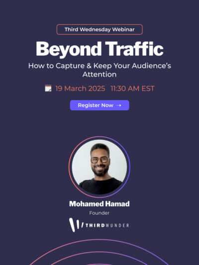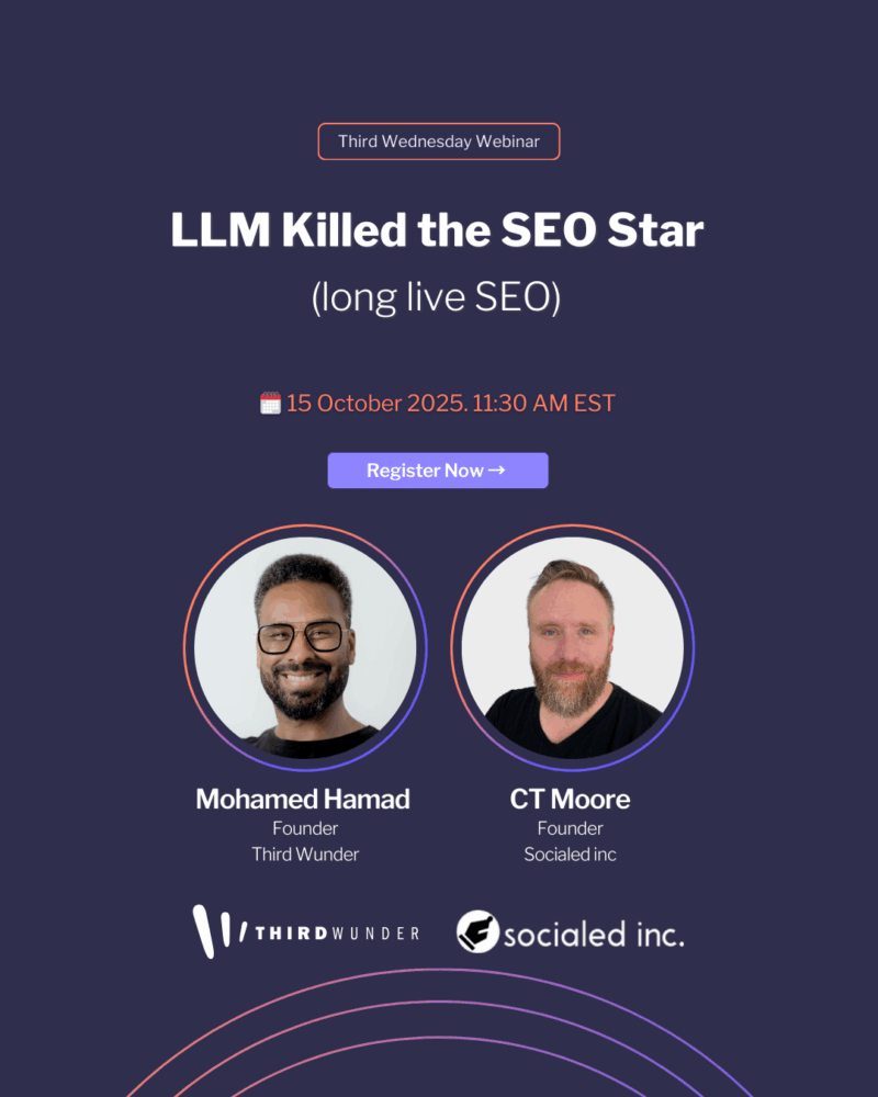Events with Wunder Third Wednesday Webinars and Third Wunder hosted events. Events LLM Killed the SEO Star AI search is scraping content, click-through rates are collapsing, and the old playbooks no longer work. If your traffic has dropped and rankings feel unstable, you are not alone. Thriving in Marketing’s AI Powered Frontier At the Marketing Meetup event in Montreal, Mohamed Hamad presents a new growth cycle built around adaptability, trust, and first-party insight.