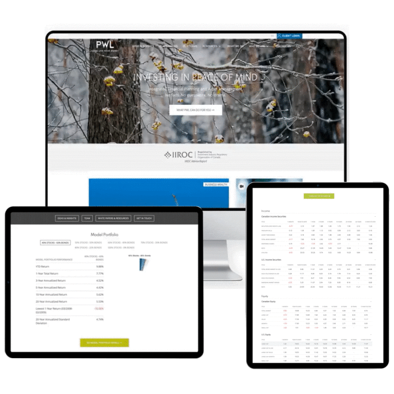 PWL Capital Simplifier la richesse pour les Canadiens PWL Capital est une société privée de gestion de patrimoine qui gère plus de 10 milliards de dollars d’actifs. Elle possède des bureaux à Montréal et à Toronto, ainsi que des bureaux de réseau à Ottawa et à Waterloo, au service de ses clients dans tout le Canada. L’enjeu Étant donné que les conseillers financiers de PWL créent et partagent une multitude de contenus variés, ils avaient besoin d’une plateforme facile à naviguer, qui inspire les clients, augmente le nombre de visiteurs et génère des prospects. Leur objectif était de simplifier la finance et de mettre en valeur le leadership éclairé de PWL à travers les différents supports de contenu créés par leurs conseillers. Planifier la croissance L’équipe de PWL avait besoin d’un site qui représente au mieux son expertise et ses offres de services. Après avoir mené une étude de marché approfondie sur l’industrie de l’investissement et dressé un inventaire du contenu de tous les actifs de PWL, nous avons créé leur nouveau plan de site amélioré. Afin d’élaborer une stratégie numérique efficace, notre équipe a mené un audit SEO complet, une analyse concurrentielle et a développé une feuille de route de contenu pour guider le processus éditorial de l’équipe PWL. Maximiser l’expérience utilisateur et améliorer le design Nous avons développé une architecture de l’information et une interface utilisateur complète pour représenter au mieux leur contenu, ainsi que des CTA dynamiques et des pages d’atterrissage pour la génération de leads. En collaboration avec la designer Christine Texeira, nous avons transformé la présence de la marque avec un look et un ressenti rafraîchis et contemporains qui s’adressent à une clientèle fortunée. Construire le portail Afin de fournir une solution élégante de capture de prospects qui s’intégrerait à l’EMS de leur choix et qui serait facile à utiliser en interne par l’équipe de PWL, nous avons développé leur site web à partir de zéro sur le CMS WordPress. Les conseillers et l’équipe marketing de PWL avaient besoin d’analyses détaillées de leur contenu pour mesurer leur succès. En utilisant Google Analytics et les tableaux de bord personnalisés de Data Studio, nous avons mis en place des rapports visuels faciles à digérer sur lesquels ils pouvaient agir. Rendre la finance accessible L’équipe de recherche de PWL dispose également d’une bibliothèque de ressources constamment mise à jour, comprenant des statistiques de marché riches en données, des documents d’analyse de portefeuille détaillés et des calculateurs d’investissement. Pour simplifier cette mine de données, nous avons développé des solutions personnalisées permettant la visualisation facile et interactive de tableaux et de graphiques. Les résultats Le nouveau site web de PWL a augmenté l’engagement avec les clients potentiels et les clients existants en présentant leur contenu riche et diversifié dans une plate-forme facile à naviguer, ce qui a stimulé les conversions et les pistes de chaque équipe.