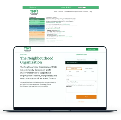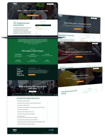 TNO Toronto S’unir pour soutenir la communauté The Neighbourhood Organization (TNO) est une agence communautaire multiservices qui fournit un large éventail de services communautaires à Toronto. Il s’agit d’une organisation caritative à but non lucratif financée par des dons, des subventions gouvernementales, le soutien de fondations et des partenariats avec des entreprises. Le mandat TNO a été durement touchée par la pandémie, dont la communauté qu’elle servait a subi l’impact économique et social. Plus que jamais, ils avaient besoin de collecter des fonds pour soutenir leur communauté, mais le flux d’utilisateurs de leur site web actuel était inefficace et les donateurs avaient du mal à trouver où faire leurs contributions. Nous avons travaillé en collaboration avec les membres de l’équipe et les bénévoles de TNO dans le cadre d’une initiative pro-bono, dans le but de construire un écosystème de pages d’atterrissage qui tireraient parti de leur subvention Google Ads de 10 000 $ et conduiraient les donateurs vers les initiatives communautaires les plus importantes de TNO. Créer des histoires percutantes qui créent des liens Contrairement à leur site web existant, qui sert de centre d’information sur leurs différentes offres et leurs protocoles de sécurité, ces pages d’atterrissage s’adressent directement à leurs donateurs. Cela signifiait que le message devait être actualisé pour que leur contenu trouve un écho favorable auprès de leur public cible. Pour ce faire, nous avons opté pour un ton et une imagerie plus empathiques afin de donner aux pages une valeur émotionnelle qui leur permettrait de mieux s’adapter aux donateurs bienveillants et compatissants. Nous avons également choisi une palette de couleurs contrastées et développé les histoires des pages pour renforcer l’impact positif et direct de TNO sur la vie de la communauté qu’elle sert. Orienter les donateurs vers les zones où les besoins sont les plus grands Les pages d’atterrissage ont été structurées autour d’un formulaire intégré à CanadaHelps, la plateforme de dons de TNO, afin de s’assurer que toute la navigation et les messages renforcent l’objectif de collecte de dons. Les pages présentaient l’impact direct de TNO sur la communauté, avec des résultats mesurables, des témoignages et des images des initiatives en action. Obtenir des informations plus approfondies Au final, nous avons créé 9 pages d’atterrissage pour les dons – 8 pages spécifiques à un service et 1 page générale pour les dons. Les pages ont ensuite été promues grâce à une subvention Google Ads de 10 000 dollars. La séparation des pages en différents services a permis à TNO de cibler certaines catégories de donateurs et de suivre les dons faits à des programmes spécifiques, ce qui lui a permis d’avoir une vision plus approfondie de ses acquisitions de fonds. Ils se sont montrés extrêmement compétents et innovants, en particulier lorsqu’il s’est agi de nous aider à raconter notre histoire afin d’accroître l’engagement de nos donateurs en ces temps difficiles. Les résultats Les pages d’atterrissage qui ont été lancées ont dépassé les attentes. En travaillant en collaboration avec TNO et les bénévoles de la communauté, nous avons pu optimiser les efforts déjà fructueux de TNO pour les aider à maximiser leur portée et à obtenir encore plus de dons. La campagne a permis de tripler le montant des dons pendant la saison des fêtes par rapport à l’année précédente (2019).